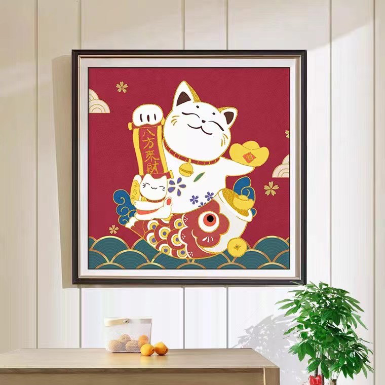 DIY Diamond Painting Full kucing gemuk pengundang rezeki ikan koi dan yuan bao emas 40×40 cm D432